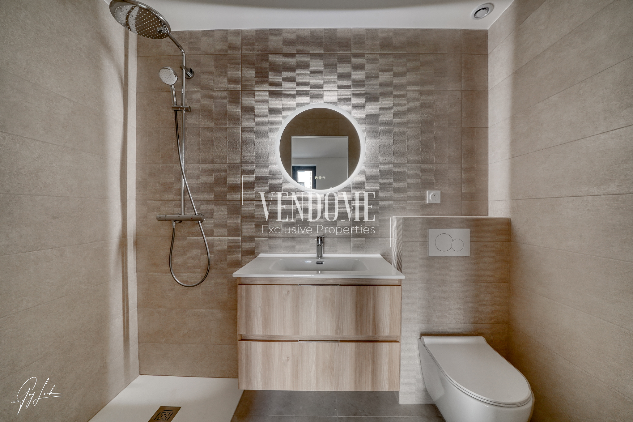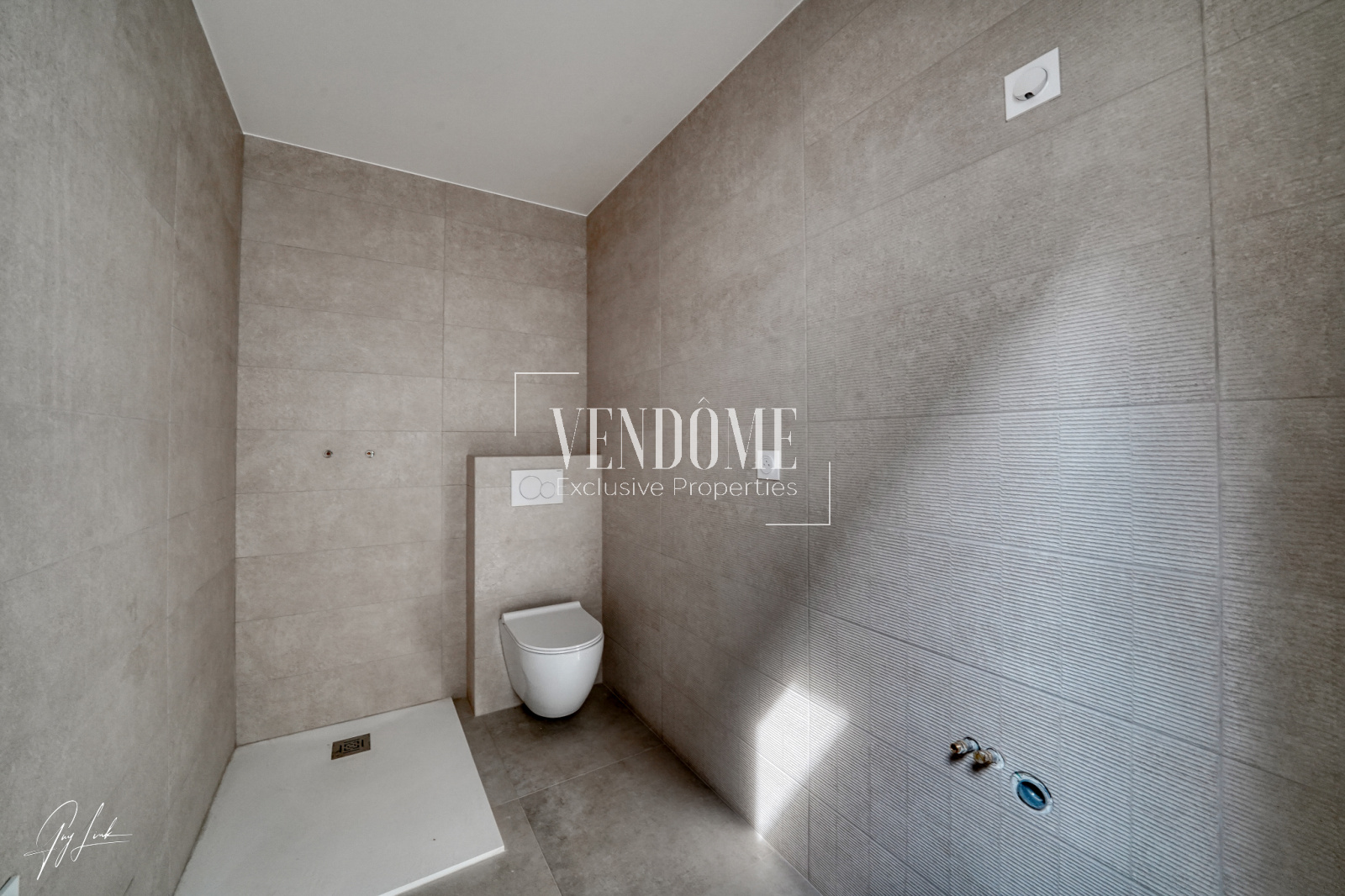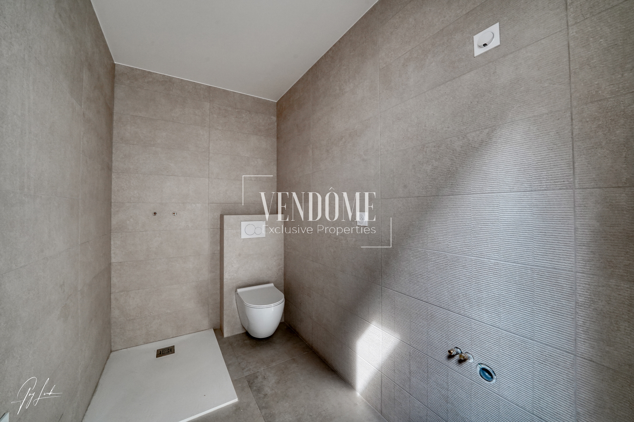 Carrelage grès texturé, équipements Grohe, WC suspendus,